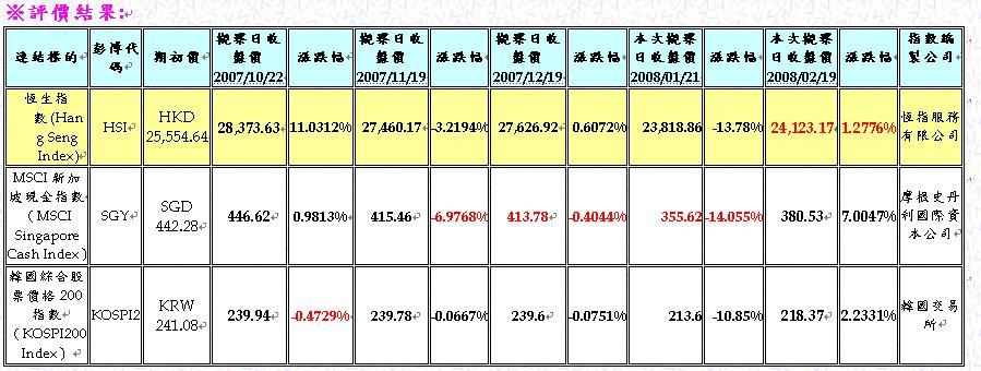 ※評價結果: ->此次觀察結果為: 本次表現最差連結標的為恆生指數 (Hang Seng Index)(HSI Index)觀察日收盤價為HKD 24,123.17,漲幅為1.2776% ; 截至目前為止累計表現因素為(-0.4729%)+(-6.9768%)+(-0.4044%)+(-14.055)+1.2776= -20.6315% ->預計下次觀察日為2008/03/19;下一次收益配發日為2008/03/28